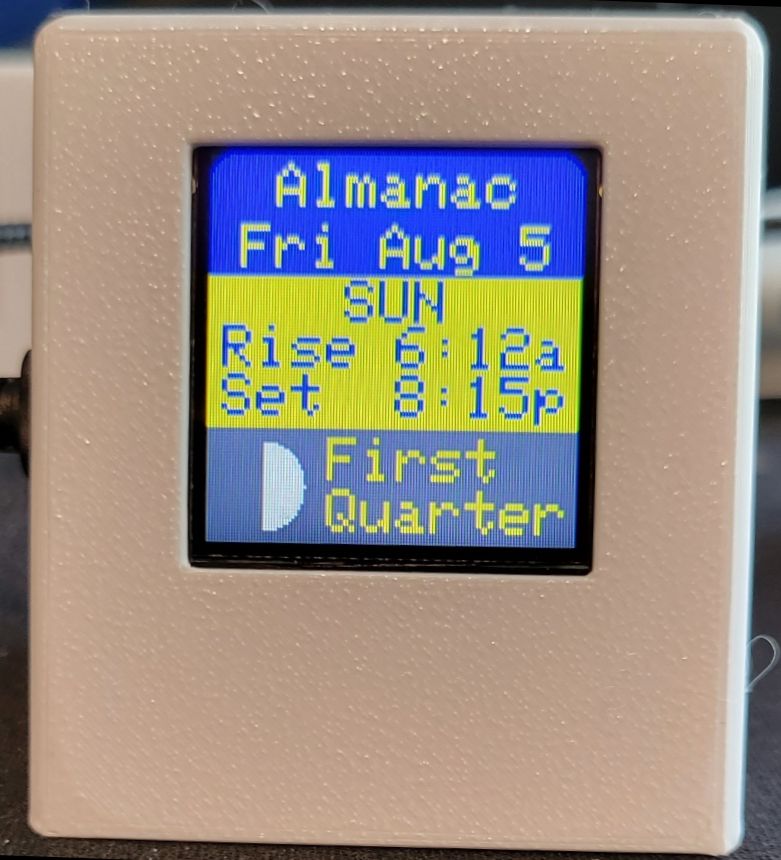 • An almanac shows local sunrise and sunset times and the moon phase as a graphic.
