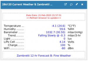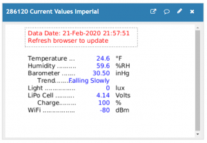 This MATLAB visualization shows current values from your weather station in metric and conventional US units. The barometric pressure and trend are used to make a Zambretti weather prediction good for about 12-hours. The values are taken from your ThingSpeak channel at the time your webpage is opened. You must manually update the chart by …